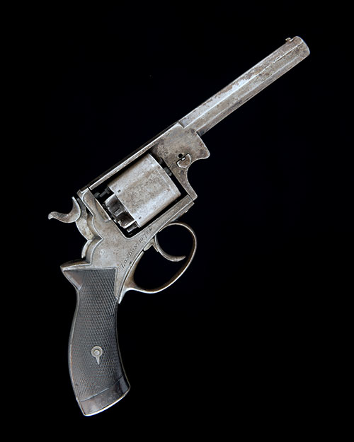 circa 1860, with octagonal 5 1/2in. barrel, dove-tailed blade fore-sight, borderline engraved top-strap, plain cylinder, borderline engraved frame marked 'LONDON' together with the serial number on the right hand side, spurred hammer, semi saw-back chequered walnut grips, iron grip-straps with integral pommel, attached articulated rammer mounted to left hand side of barrel, traces of finish in sheltered areas, some screws replaced