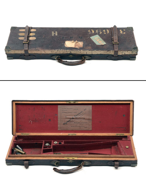 fitted for 30in. barrels, the interior lined with red baize, central brass lock (including key), the lid interior with a 'COGSWELL & HARRISON LTD' trade label, the lid exterior with the monogram 'E.W.M.', handle broken
