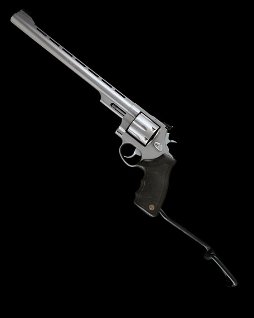recent, with 12in. barrel, raised ventilated rib, ramp fore-sight with 'Patridge' blade, micro-adjustable rear-sight, fluted swing-out cylinder, solid frame, factory fitted stippled soft-rubber grip, plastic-coated non-detachable wire arm-brace (specifically for the UK market) and trigger with over-ride stop, the whole appearing little used