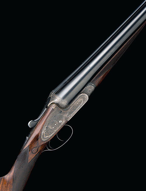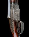 26in. sleeved nitro barrels, 2 1/2in. chambers, bored approx. imp. cyl. and 1/4 choke, treble-grip action, automatic safety with 'SAFE' detail, cocking-indicators, floral bouquet and acanthus scroll engraving, retaining traces of original colour-hardening and finish, 14 3/8in. figured stock, weight 6lb. 6oz., in a lightweight leather case