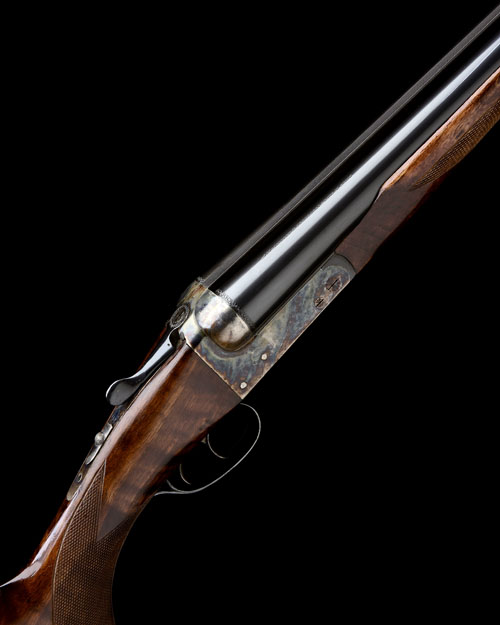 32in. nitro chopperlump barrels with raised matt rib, 89mm chambers, bored approx. full choke in both, automatic safety, removable striker discs, plain action retaining virtually full original colour-hardening and finish, 14 5/8in. figured pistolgrip stock with pistolgrip-cap and buttplate, beavertail fore-end, weight 9lb. 7oz.