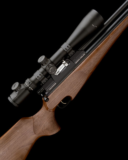 recent, with shrouded matt-black barrel including built-on muzzle-break, bolt-action receiver with rotary magazine feed, matt-black under-barrel air-reservoir, custom walnut right-handed ambidextrous full-stock, TOGETHER WITH a Besonder Optisch 6-24x52 parallax adjustable target telescopic sight