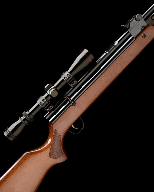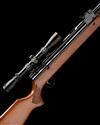 circa 1983, with blued 22in. barrel including built-on anodised 'Gallwey' sound-moderator (foresight removed), adjustable rear-sight, the breech block marked with the maker, model details and calibre on the right hand side of breech-block and 'PAT PENDING REGISTERED DESIGN' on the left, blued air-chamber surmounted with a full-length bolt-action receiver railed for a telescopic sight, ambidextrous beech half-stock with pressed chequering to the pistol-grip, ventilated rubber recoil-pad, black crackle finish to the trigger-guard and blued underlever (some loss to finish on lever) COMPLETE WITH an unsigned 3-9x40 telescopic sight, two-piece mounts and its makers original card carton depicting the rifle together with the Sterling Armaments revolver, submachine gun and assault rifle (end-flap gone)