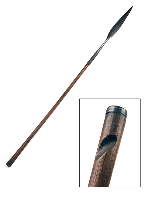 circa 1910, forged head 22 3/4in. in length with narrow leaf-shaped 13 1/2in. blade and machined knurling to the socket, the neck stamped with a broad arrow within a letter 'U', the serial number and 'IPU27', 35 1/2in. hardwood shaft swelling at the base also stamped 'IPU27', special thumb cut-out and iron heel-cap, complete with a reproduced photograph of native police officers drilling with similar spears