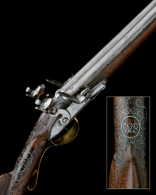 Continental, circa 1780, with 34in. barrels, boat-shaped bead fore-sight, eared sighting groove to the border and acanthus scroll engraved top-tang, flat, slightly curved bevel-edged step-tailed borderline engraved locks signed in script 'PISUISSE' on the right and 'A LAHAYE' on the left hand lock, slab-sided hammers, moulded frizzens, acorn terminals to the frizzen springs, scroll engraved hinge-ends to the pans, figured walnut handrail half-stock with rococco carving around the top-tang and furniture, carved and engraved brass heel-plate with vase finial to the top-spur (strong traces of gilding), inlaid silver wire scrolls to the wrist and bordering the heel-plate (some losses), inlaid silver wire bordered 'WB' monogram to top of wrist, raised tear-drop cheek-piece with carved accents, gilded and engraved rococco-bordered trigger-guard tang with vase terminal, raised gilded grip-piece with acanthus leaf engraving, flared pillar and shell gilded trigger-guard bow engraved with martial and musical trophies, vase finial, en-suite gilded ramrod throat, gilded ramrod pipes, iron swivels and horn-tipped ramrod