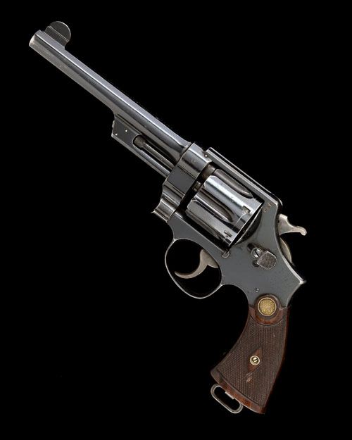 circa 1909, with blued, round 6 1/2in. barrel, makers details and patent dates to 1906 on the top of barrel, full crescent fore-sight, blued fluted cylinder, plain blued frame chequered walnut grip-plates with inset 'Smith & Wesson' monogrammed medallions to top and lanyard loop to butt, the whole retaining much original finish (some fading to areas on barrel)