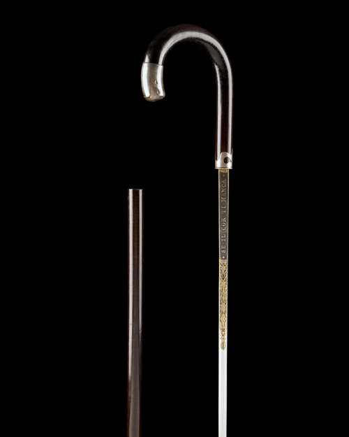 circa 1875, with tapering polished 27 1/2in. narrow blade false edged for the last 9 1/2in., central blind narrow fuller, the first 8 1/2in. featuring gilded arabesques on a blued ground with the motto 'SE IL COR TI MANCA' on the right and 'NON TI FIDAR DI ME' on the left hand side of blade translating as 'Don't trust in me, if you don't have the heart', crooked hardwood handle with pierced silver mount at the join and bag-shaped silver end-cap, TOGETHER WITH its plain hardwood scabbard with iron ferrule, 35 1/2in. overall, some shrinkage cracks to wood