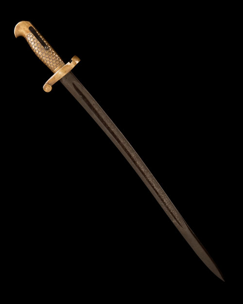 circa 1862, with darkly stained 20in. yataghan style blade fullered on both sides, stamped with a 'B' at the ricasso on one side and a possible continental makers mark on the other, solid brass hilt, the cross guard with lower drum quillion and solid muzzle-ring with side-notch, cast 'fish-scale' pattern grip with 'eagle' pommel and spring steel release catch, missing scabbard