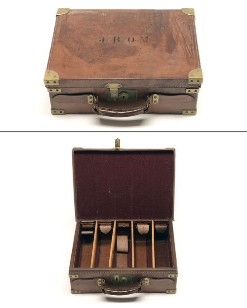 for approx. 250 cartridges, the interior lined with maroon baize, brass lock (key missing), four oak dividers, five leather lifters, the lid exterior with the monogram 'J.B.O.M.'