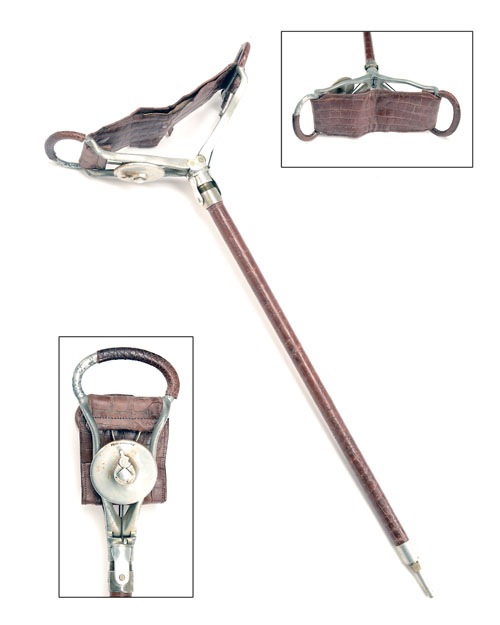 with crocodile skin and alloy seat hinged at the neck, opening to reveal a silk parasol contained within the crocodile skin bound shaft, engraved with the makers details and 'B. SEEDS'