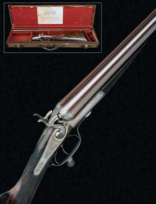 30in. black powder only damascus barrels, rib engraved 'BOSS & CO. 73 ST. JAMES'S STREET. LONDON.', 2 1/2in. chambers, bored approx. true cyl. and 1/2 choke, Jones patent rotary-underlever, carved percussion fences, rebounding back-action locks, fine border and acanthus scroll engraving, brushed finish overall, 14 3/8in. highly-figured stock with engraved steel heel and toe plates, diminutive fore-end with grip-catch release lever, weight 6lb. 8oz., in a canvas and leather case