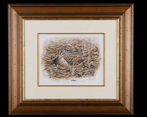 an original pin feather painting of a nesting woodcock, signed by the artist, mounted in an antique style frame