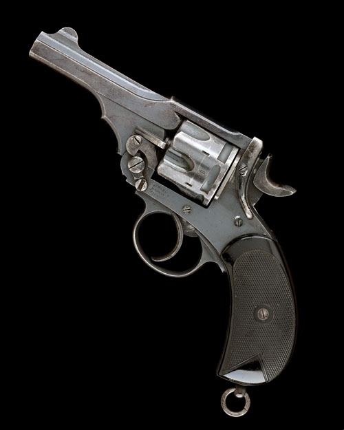circa 1910, with 4in. barrel, integral blade fore-sight, holster-guides, blued fluted cylinder with narrow locking slots, stirrup barrel-catch, blued break-open frame, chequered hard-rubber birdshead grips, lanyard ring to heel, the backstrap stamped '7/01' (for 1901) over 'T.D. R.E.' (Territorial Division Royal Engineers), the whole retaining much original finish with slight staining mainly to barrel sides