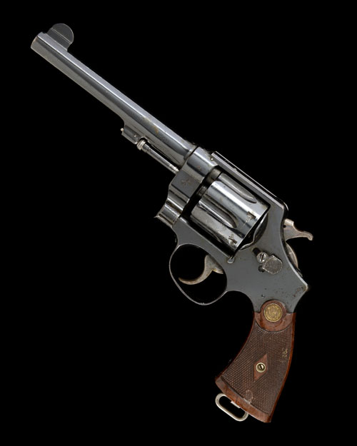 circa 1915, with 6 1/2in. signed barrel with patent dates to 1906, sighting groove to the top-strap, blued fluted swing-out cylinder, solid blued frame, colour-hardened hammer and trigger, chequered walnut grips with inlaid 'S&W' medallions and lanyard ring to heel, the whole appearing little-used, the finish covered with hardened storage grease