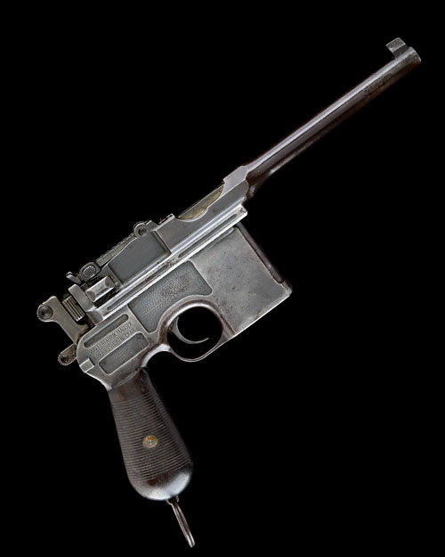 for between 1911-15, with 5 1/2in. barrel, block and tapered blade fore-sight, elevating rear-sight graduated to 1000m, small ring hammer, new-style safety, receiver with milled panels, 31 groove bag-shaped walnut grips, provision for holster-stock, lanyard ring at heel and integral magazine, finish faded to brown