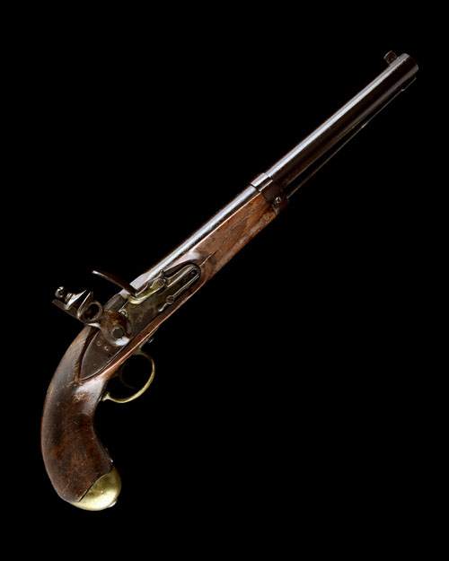A .640 FLINTLOCK SINGLE-SHOT RIFLED MILITARY HORSE-PISTOL, UNSIGNED, no visible serial number, Continental, circa 1810, round 13 1/2in. barrel with octagonal breech section, Belgian proofs, blade fore-sight, solid rounded top-tang, plain military-style lock, brass pan, hardwood half-stock (repair to fore-end) with heavy brass butt-cap to the bag-shaped butt, iron trigger-guard tang with brass bow, iron barrel-band at front of fore-end and probable replacement iron ramrod, TOGETHER WITH a purchase receipt for £125, un-dated but vendor states circa 1980