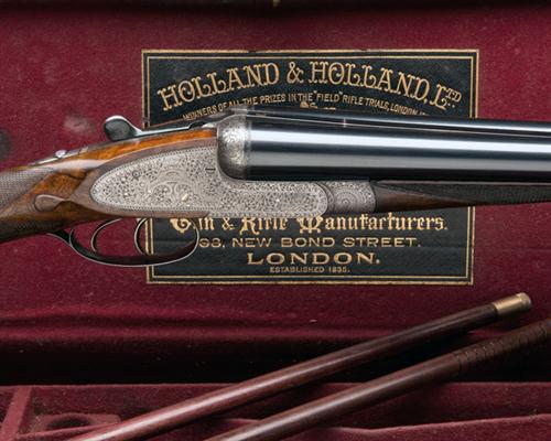 28in. nitro barrels, rib gold-inlaid '1', tubes engraved 'HOLLAND & HOLLAND. 98. NEW BOND STREET. LONDON.', 2 1/2in. chambers, bored approx. true cyl. choke in both, (shortened), right wall thickness below recommended minimum, toplever gold-inlaid '1', automatic safety with gold-inlaid 'SAFE' detail, gold-inlaid cocking-indicators, best bold Royal scroll engraving, brushed finish, 14 3/8in. figured replacement stock including buttplate, weight 6lb. 5oz., in its lightweight leather case with gold-tooled trade label and cleaning and charges label