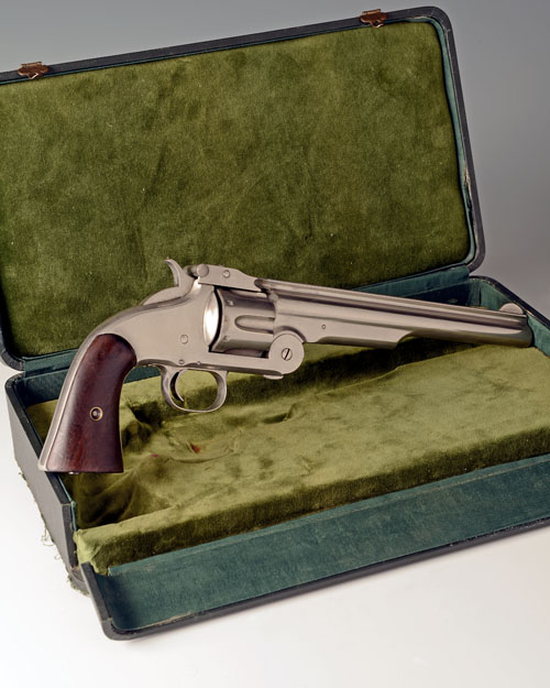 circa 1872-74, with round 8in. barrel, the raised sighting rib signed and marked with patents to 'AUG 24. 69', fluted cylinder, plain break-open frame with automatic ejection and manual over-ride, 'un-notched' hammer and smooth walnut flared grips with flat bases, the whole being an older re-nickel TOGETHER WITH an un-associated green leatherette case with rounded corners and gilded borders, the interior blocked for this pistol in the continental style and lined in green velvet (hinges at fault)