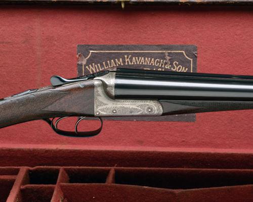 28in. nitro reproved barrels (in 2014), rib engraved 'W. KAVANAGH & SON. DAME ST. DUBLIN', 2 1/2in. chambers, bored approx. imp. cyl. and 1/2 choke, treble-grip action, the toplever carved in relief 'KAVANAGH DUBLIN', automatic safety, fine border and acanthus scroll engraving, retaining slight traces of original colour-hardening, 14 1/4in. figured stock including 7/8in. rubber recoil pad, weight 5lb. 8oz., in its canvas and leather case with gold-tooled William Kavanagh & Son trade label