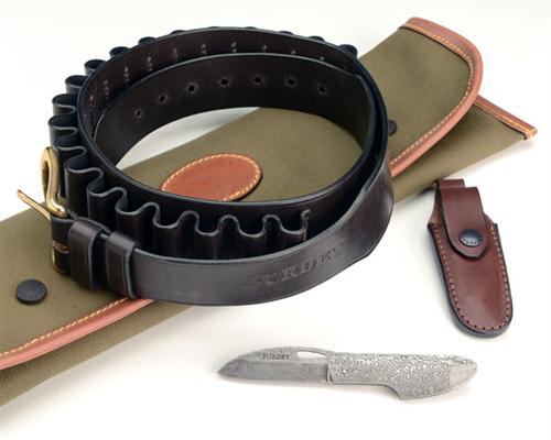 including an extra large leather cartridge belt, a 12-bore cleaning kit and a folding pocket knife with damascus blade complete with leather holder