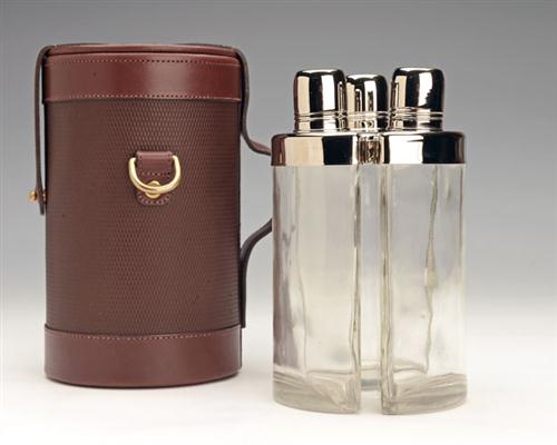 JAMES PURDEY & SONS LTD. A NEW AND UNUSED THREE FLASK LEATHER CASED TRAVEL BAR,