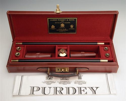 consisting of two brass and nylon cleaning rods, two leather pouches, with 20-bore and 12-bore mop, jag, brush, Purdey gun oil, 'Purdey' engraved 12-bore and 20-bore snap caps, nickel plated oil bottle, cleaning cloth, housed in a leather case, the interior lined with red baize, brass lock (including key), the lid interior with a leather gold tooled 'JAMES PURDEY & SONS LTD.' trade label