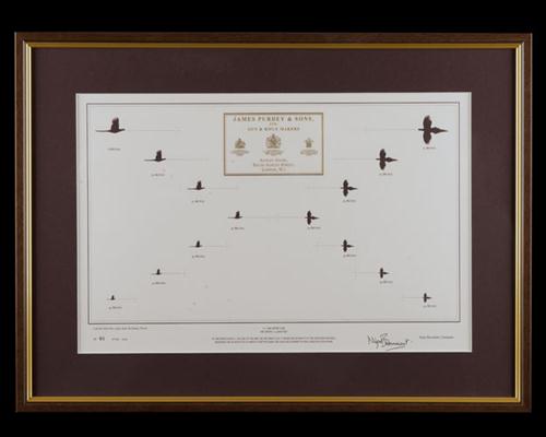 no. 91 of 100, central gold embossed Purdey trade label, surrounded by scale illustrations of pheasant in flight with apposite distances, with explanatory note: 'AT ONE ARM'S LENGTH, THE SIZE OF THE BIRD ON THE PRINT IS AS IT WOULD IN REALITY AT THE INDICATED DISTANCE. MEMORISE THE SILHOUETTES IN ORDER TO BETTER JUDGE THE LEAD AND THE DISTANCE IN REAL SHOOTING SITUATION'
