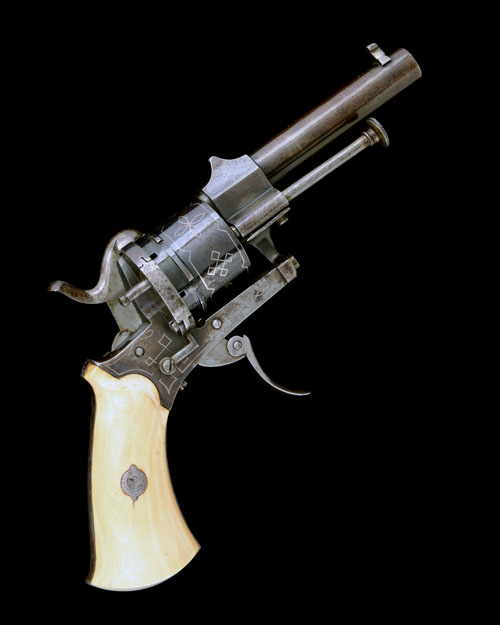 Belgian, circa 1860, with round blued 3 1/4in. barrel, dove-tailed bead fore-sight, standing notch rear-sight to the octagonal breech-section, plain blued cylinder with external ratchet locking, blued open iron frame with side loading gate and plunge ejector-rod, polished spurred hammer, flared smooth ivory grips and hinged folding trigger, the frame, cylinder, grip-straps and breech inlaid with geometric designs in silver wire, much original finish remaining