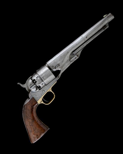 for 1863, with 8in. barrel signed 'ADDRESS COL SAML COLT NEW-YORK US AMERICA', stepped cylinder with roll-engraved scene, plain iron open frame, brass trigger-guard and front-strap, iron back-strap, all serial numbers above or below a single letter 'S', smooth walnut one-piece grip, all metalwork stripped of finish
