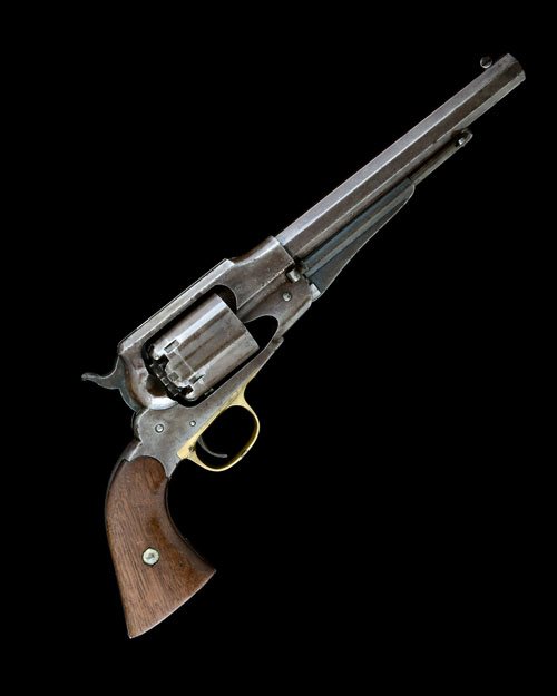circa 1868, with blued 8in. barrel marked 'PATENTED SEPT 14 1858, E REMINGTON & SONS, ILION, NEWYORK USA, NEW-MODEL', pillar blade fore-sight, sighting groove to the top-strap, plain blued cylinder, solid frame, silver-plated trigger-guard, smooth walnut grips and blued under-barrel rammer, traces only of faded finish