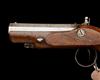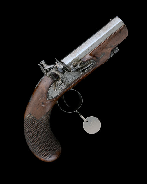 circa 1805, with octagonal 4 1/4in. barrel signed on the top-flat 'DUBLIN', small applied crescent fore-sight, standing notch rear-sight, engraved band at breech, engraved top-tang, flat, slightly curved border line engraved lock signed 'RIGBY', engraved bevel-edged hammer-breast, rain-proof pan, borderline engraved frizzen, bevel-edged frizzen-spring with roller-bearing, walnut full-stock with coarse chequered bag-shaped butt, oval silver escutcheon to the wrist, iron trigger-guard bow and tang with engraved pineapple finial and provision for ramrod (missing), complete with its Small Arms School Corps collection identification tag
