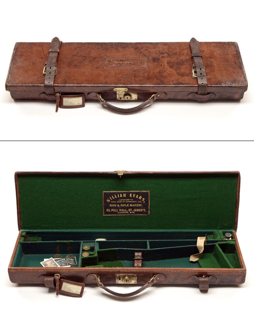 fitted for 28in. barrels, the interior lined with green baize, brass lock (key missing), the lid interior with a 'WILLIAM EVANS' trade label