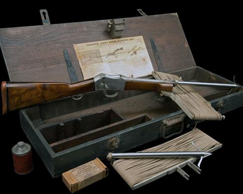 in its wood trunk case with wing nut securing bolts, complete original trade/instruction label, with two harpoons, two line release frames and an empty cartridge box with ICI label designating 'SPECIAL CARTRIDGES FOR GREENER LIGHT HARPOON GUN', nickel finish martini-style action marked 'GREENER'S HARPOON GUN. PATENT 421578', and 'W.W. GREENER. 40 PALL MALL. LONDON. S.W.', the receiver marked 'SPECIAL AMMUNITION', barrel marked '14 GR NO.5 CORDITE HARPOON 10.OZ. MAX'.,
