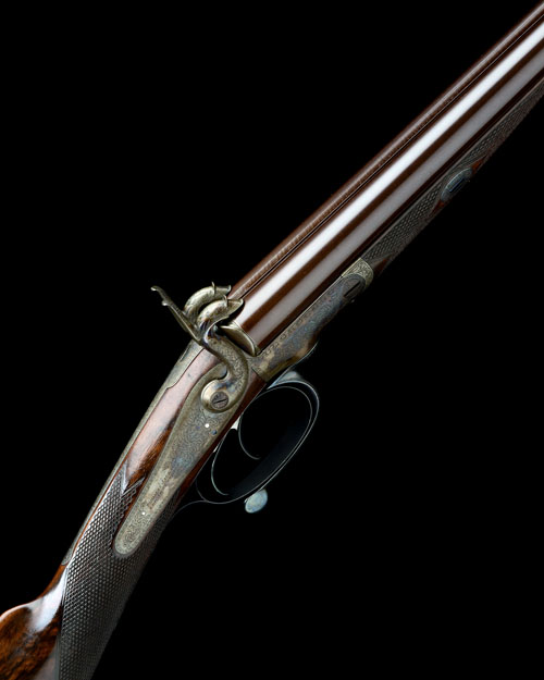 circa 1865, with rebrowned 30in. damascus barrels, the top rib signed 'THOMAS JACKSON 29 EDWARDS STREET, PORTMAN SQUARE, LONDON', inlet bead fore-sight, scroll engraving to the rib-end and around the pin-holes, fully scroll engraved elongated top-tang, border and scroll engraved back-action locks signed 'THOMAS JACKSON, EDWARDS STREET', scroll engraved hammers, highly figured walnut straight-hand butt-stock, chequered at the wrist, re-blued heel-plate with scroll engraved short top-spur, border and scroll engraved trigger-guard and bow, 'Jones' patent swing underlever, scroll engraved rounded action and chequered splinter fore-end, the iron surfaces re-coloured to a high standard throughout