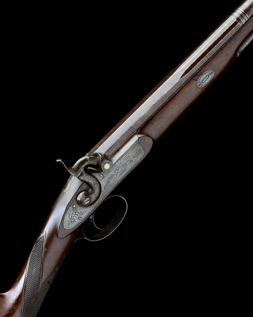 circa 1860, with triple-staged twist-iron 26 1/2in, barrel banded at the intersection, bead fore-sight, patent squared breech with white-metal plug, top of breech engraved with scrolls, fully scroll engraved top-tang, scroll engraved bar-action lock with a panel engraved with a running dog, signed 'CHAS. OSBORNE' forwards of the hammer, scroll engraved hammer, walnut half-stock chequered at the wrist, iron heel-plate, the long top-spur engraved with scrolls, iron trigger-guard bow, pillar finial, fore-end with horn tip and original ebony ramrod