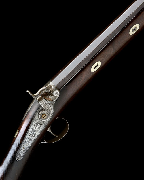 circa 1860, with two-stage 34in. twist iron barrel banded at the intersection, bead fore-sight, scroll engraving to the top-flat at breech, scroll engraved top-tang, borderline and scroll engraved back-action lock signed 'BLANKS & ROCHFORD', scroll engraved hammer (spindle screw replaced), walnut half-stock chequered at the wrist (worn smooth), iron heel-plate with long top-spur, clipped corner rectangular escutcheon behind top-tang, iron trigger-guard bow and tang and original horn-mounted ramrod