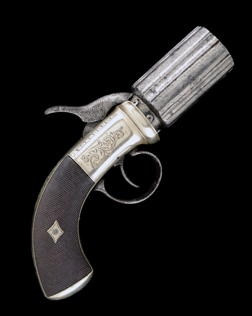 A 100-BORE PERCUSSION SIX-SHOT SINGLE-ACTION PEPPER-BOX REVOLVER, UNSIGNED, no visible number,