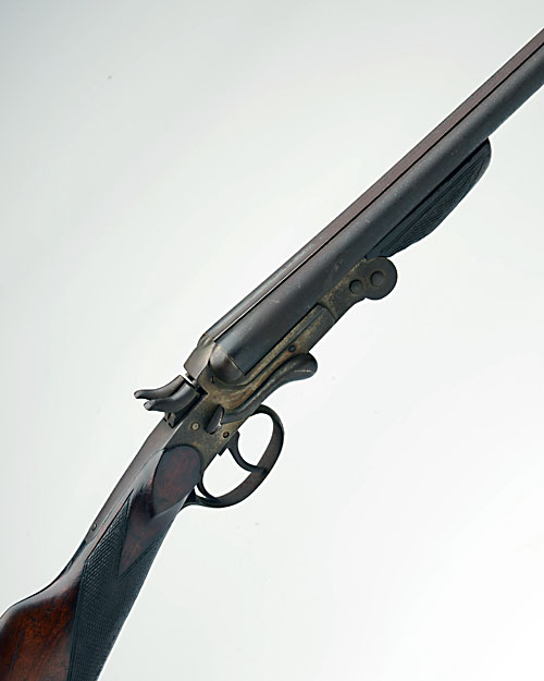 A BELGIAN .410 DOUBLE-BARRELLED SIDELEVER FOLDING HAMMERGUN, serial no. 56601, 28in. nitro barrels, 2 1/2in. chambers, some pitting