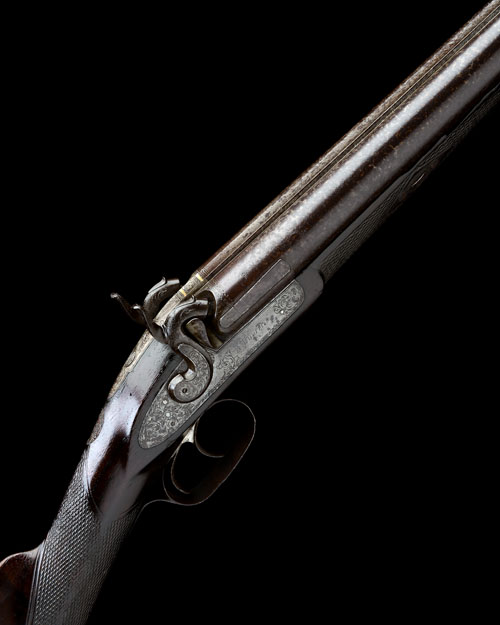 circa 1855, with heavy twist iron Belgian proved 31in. barrels, the top rib signed 'A. WURFFLEIN, PHILADA', bead fore-sight, engraved bands and scroll-work at breech together with two gold lines, borderline and scroll engraved top-tang, flat border and scroll engraved bar-action locks signed 'A. WURFFLEIN' on the right and 'PHILADA' on the left, scroll engraved hammers, figured chequered walnut half-stock with carved borders (escutcheon missing from wrist), iron heel-plate, trigger-guard and original mahogany ramrod, iron surfaces darkly stained