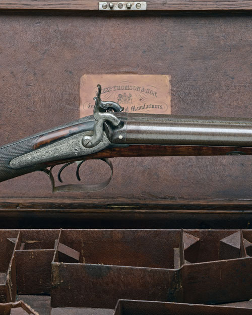 circa 1855, with slightly shortened 30in. damascus barrels, scroll engraving to rib-end, platinum plugs, scroll engraved elongated top-tang, scroll and game-scene engraved back-action locks signed 'A. THOMSON' beneath the hammers, figured walnut half-stock, chequered at the wrist, iron furniture including square-backed trigger-guard bow, original ramrod, TOGETHER WITH its manufacturers oak storage case, compartmented and lined in maroon (faded to brown) pebbled leatherette with parchment trade-label to inside of lid