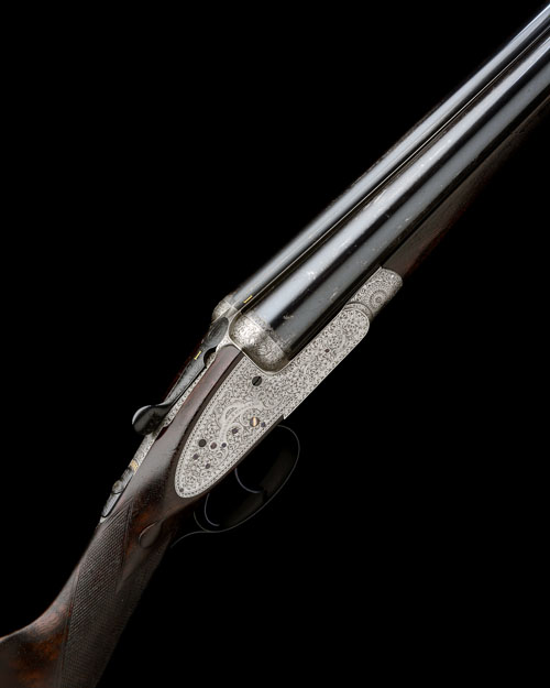 30in. nitro barrels, rib gold-inlaid '1' and the tubes engraved 'HOLLAND & HOLLAND. 98. NEW BOND STREET. LONDON.', 2 1/2in. chambers, bored approx. true cyl. and 1/4 choke, right wall at 20-, some pitting, toplever gold-inlaid '1', automatic safety with gold-inlaid 'SAFE' detail, partially blued gold-inlaid cocking-indicators, bold Royal scroll engraving, the underside with a cartouche engraved 'ROYAL HAMMERLESS EJECTOR', bright finish, 14 1/4in. well-figured stock with raised comb, minor crack at hand, crack to left overhorn, repair to right overhorn, horn buttplate, weight 6lb. 9oz.