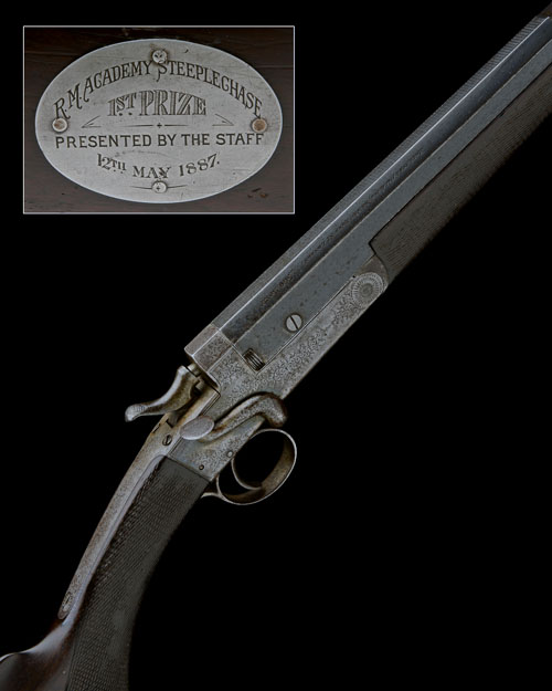28in. nitro reproved octagonal barrel (smoothbored to .410 from .360 rook), matt top flat, open sights removed, bead fore-sight, the breech end engraved 'HOLLAND & HOLLAND. 98 NEW BOND ST. LONDON. .360 BORE. WINNER OF ALL THE 'FIELD' RIFLE TRIALS 1883', 2 1/2in. chamber, bored approx. true cyl. choke, non-selective ejector, acanthus scroll engraving, 14 1/2in. pistolgrip stock with engraved steel pistolgrip-cap and steel buttplate, the stock with large oval white metal plaque inscribed 'R.M. ACADEMY STEEPLECHASE - 1ST PRIZE - PRESENTED BY THE STAFF - 12TH MAY 1887', snap fore-end with horn finial, weight 5lb.