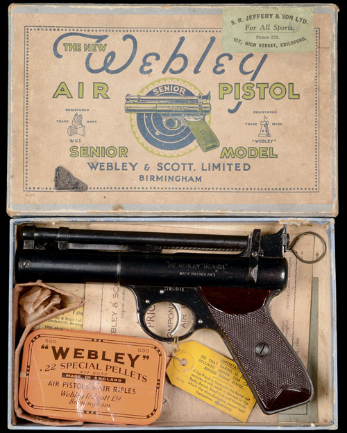 for 1936, with blued 6 1/2in. barrel, blade fore-sight, adjustable notch rear-sight, blued air-chamber marked 'THE WEBLEY SENIOR' and 'MADE IN ENGLAND' on the left hand side and 'WEBLEY & SCOTT LTD BIRMINGHAM' together with three lines of patents, three pin trigger-group, brown bakelite chequered grips, the whole remaining in fine order with slight speckling from storage COMPLETE WITH its manufacturers pale blue card carton containing the air-pistol, a rectangular orange tin of .22 pellets, a period price-list, the spare breech-washer, original swing-ticket and cleaning brush