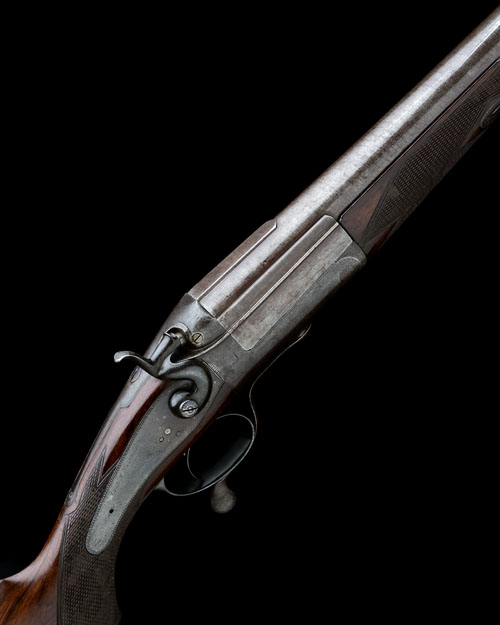 39in. nitro reproved twist barrel, Jones patent rotary-underlever, carved percussion fence with broad striker, rebounding back-action lock, beaded border engraving, 14 1/2in. figured pistolgrip stock with horn pistolgrip-cap and buttplate, fore-end with crosspin release, exposed loop, minor damage and repairs and horn finial, weight 11lb. 1oz.