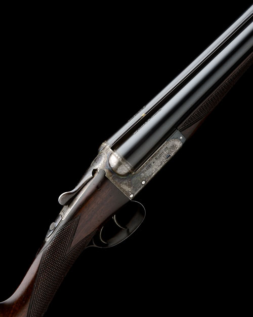 26in. nitro barrels, rib gold-inlaid 2", tubes engraved 'WEBLEY & SCOTT LTD. BIRMINGHAM', 2in. chambers, bored approx. 1/4 and full choke, automatic safety, border and scroll engraving, retaining some original colour-hardening and finish, 14 1/2in. stock including 2 1/4in. wooden extension, weight 5lb. 11oz.