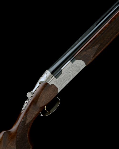 28in. nitro barrels with 6mm ventilated matt top-rib, 3in. chambers, bored approx. 1/4 and 1/2 choke, hold-open toplever, automatic safety with integral barrel selector switch, border and scroll engraving, satin finish, gold-washed trigger, 14 1/2in. pistolgrip stock including rubber buttpad, weight 7lb. 3oz.