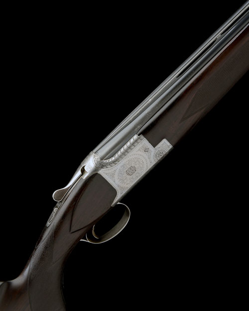 30in. nitro barrels with 12mm ventilated matt top-rib with intermediate bead sight, 2 3/4in. chambers, bored approx. 1/4 and 1/2 choke, right extractor with small fracture, hold-open toplever, manual safety with integral barrel selector switch, gold-washed trigger, floral and scroll engraving, bright finish, 14 1/4in. pistolgrip stock including buttplate, weight 7lb. 11oz.
