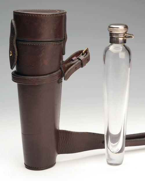 glass flask (approx. 9in.) with pewter hinged twist cap, with leather suede-lined saddle case