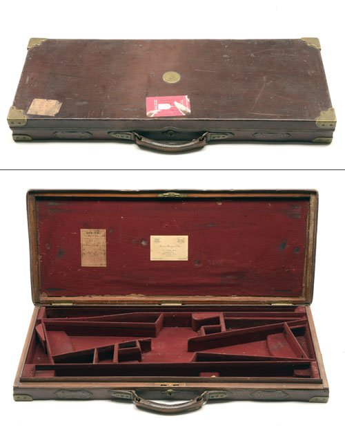 JAMES PURDEY & SONS A BRASS-CORNERED OAK AND LEATHER DOUBLE GUNCASE,