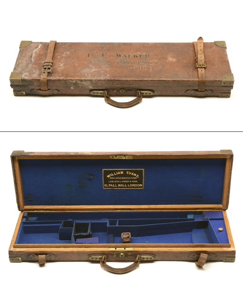 fitted for 28in. barrels (could adapt to 31in.), the interior lined with blue baize, central brass 'J. BRAMAH' lock (key missing), the lid interior with a leather gold-tooled 'WILLIAM EVANS, LATE WITH J. PURDEY & SONS, 63, PALL MALL LONDON' trade label, the lid exterior with 'F.E. WALKER RAVENSTHORPE MANOR, THIRSK'